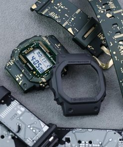 El DWE-5600CC-3 tiene un estilo de camuflaje con un bisel y una banda verdes impresos con un diseño de placa de circuito 5600, que también se extiende hasta la cara exterior. El reloj forma parte de una caja que también incluye un bisel negro mate y una correa con la inscripción “3229” que representa el número de módulo. También se incluye una banda de tela en blanco y negro con un acabado luminiscente y reflectante e impresa con imágenes de placas de circuito.
