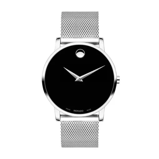 El Movado Museum 0607219 redefine el minimalismo. Su esfera negra con punto espejado transmite pureza visual, elegancia moderna y equilibrio absoluto.
